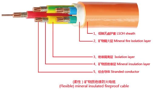 2.柔性礦物絕緣防火電纜(BBTRZ)的組成 柔性礦物絕緣電纜是由銅絞線、礦物化合物絕緣、和礦物化合物護(hù)套所構(gòu)成。這種電纜具有不燃、無煙、無毒和耐火特性。