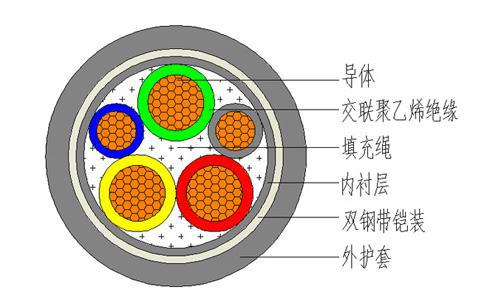 交聯(lián)聚乙烯代號為YJ,鎧裝層代號2-雙銅帶、3-細(xì)鋼絲、4-粗鋼絲。